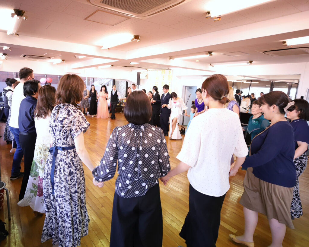 「輪になって踊ろう」はマイムマイム。多くの方が一度は踊ったことがあるイスラエル発祥のダンス。今年生まれたばかりの赤ちゃんから〇〇歳までの皆さんまで、平和を願って1つの輪で踊りました。